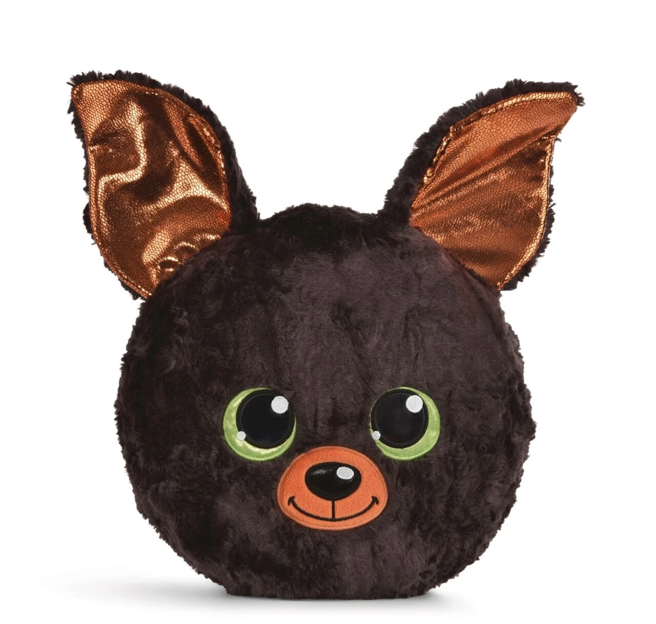 Das Plüschkissen GLUBSCHIS Fledermaus Wakiki in der Form eines Fledermauskopfes ist nicht nur flauschig weich, sondern begeistert mit einem bezaubernden Gesichtsausdruck, großen, grünen Glitzeraugen, einer schwarz glänzenden Nase und schimmernden Fledermausohren in Bronze. Das Kissen aus dunkelbraunem NICI-Plüsch ist ein wunderschöner Blickfang und Dekoelement fürs Kinderzimmer.