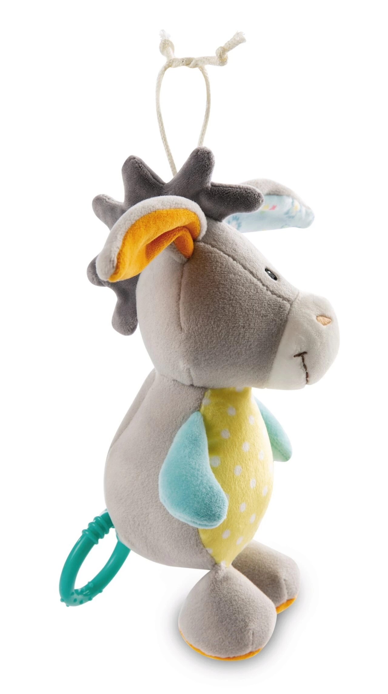Die plüschige Spieluhr in Gestalt eines niedlichen grauen Esels im gelb-weiß gepunkteten Pyjama mit unterschiedlich farbigen Ohren und Armen ist ein unverzichtbares Geschenk zur Geburt oder Taufe. Zieht man an dem kleinen Ring, der mittels einer Schnur am softig weichen Körper des 18 cm großen Esels befestigt ist, kommt die eingearbeitete Spieluhr zum Einsatz und Baby wird mit Mozarts Wiegenlied ins Reich der Träume begleitet. Mit Hilfe von zwei Bändchen lässt sich die Spieluhr ganz einfach am Bettchen, Kinderwagen oder Babyschale befestigen. Die Spieluhr Esel aus der MyFirstNICI Kollektion ist eine tolle Einschlafhilfe und fördert gleichzeitig motorische und sensorische Fähigkeiten der Allerkleinsten.